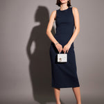 Navy Rib Sleeveless Bodycon Dress, in Rib fabric, Unlined, Midi Length, Slim Fit, No Closure, Straight Hemline and features Slit At Back