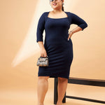 Navy Rib Square Neck Dress, in Rib fabric, Unlined, Knee Length, Bodycon, No Closure, Straight Hemline and features Square Neck Detail