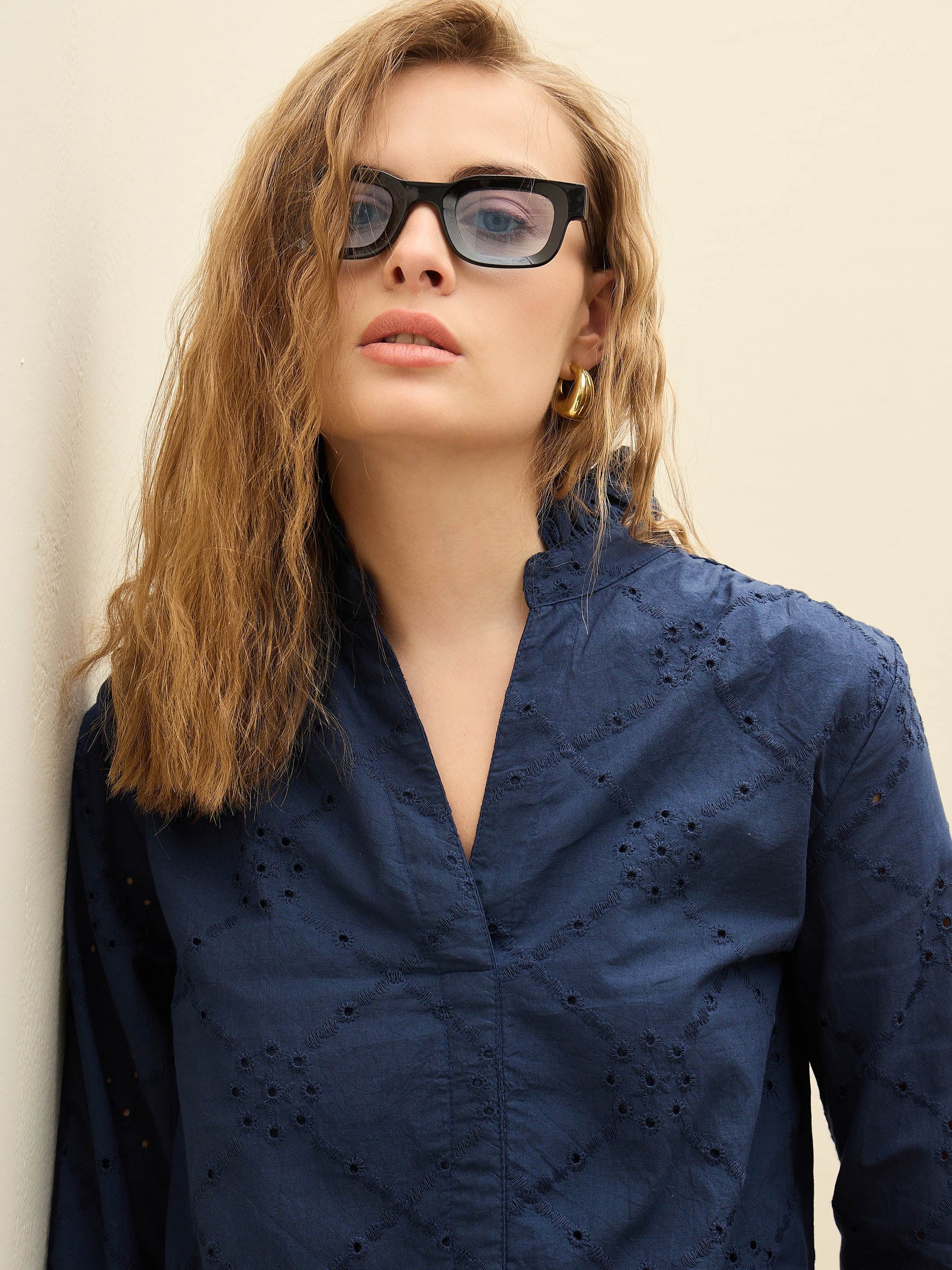 Navy Schiffli Frill Neck Short Dress, in Cotton Schiffli fabric, Cotton Lining, Short Length, Fit & Flare, NA, Flared Hemline and features Frill Detail At Neck& Sleeve Opening