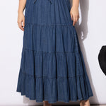 Navy Tencel Front Drawstring Tired Skirt, in Tencel fabric, Unlined, Maxi Length , Comfort Fit, Slip On, Flared Hemline and features Drawstring Detail At Front