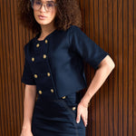 Navy Twill Double Breast Top, in Cotton Twill Lycra fabric, Unlined, Crop Length, Comfort Fit, Button Closure, Straight Hemline and features Golden Button Detail At Front