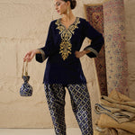 Navy Velvet Embroidered Short Kurta With Farshi Salwar, in Velvet fabric, Cotton Lining, Regular Length , Comfort Fit, No Closure, Straight Hemline and features Embroidery Detail At Neck & Sleeves