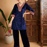 Women Navy Velvet Embroidered Short Kurta With Pants