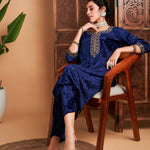 Navy Velvet Embroidered Straight Kurta, in Velvet fabric, Unlined, Calf Length, Straight Fit, NA, Straight Hemline and features Lace Detail At Sleeve