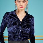 Navy Velvet Ruched Shirt, in Velvet fabric, Unlined, Regular Length, Slim Fit, Button Closure, Straight Hemline and features Self Fabric Button Detail