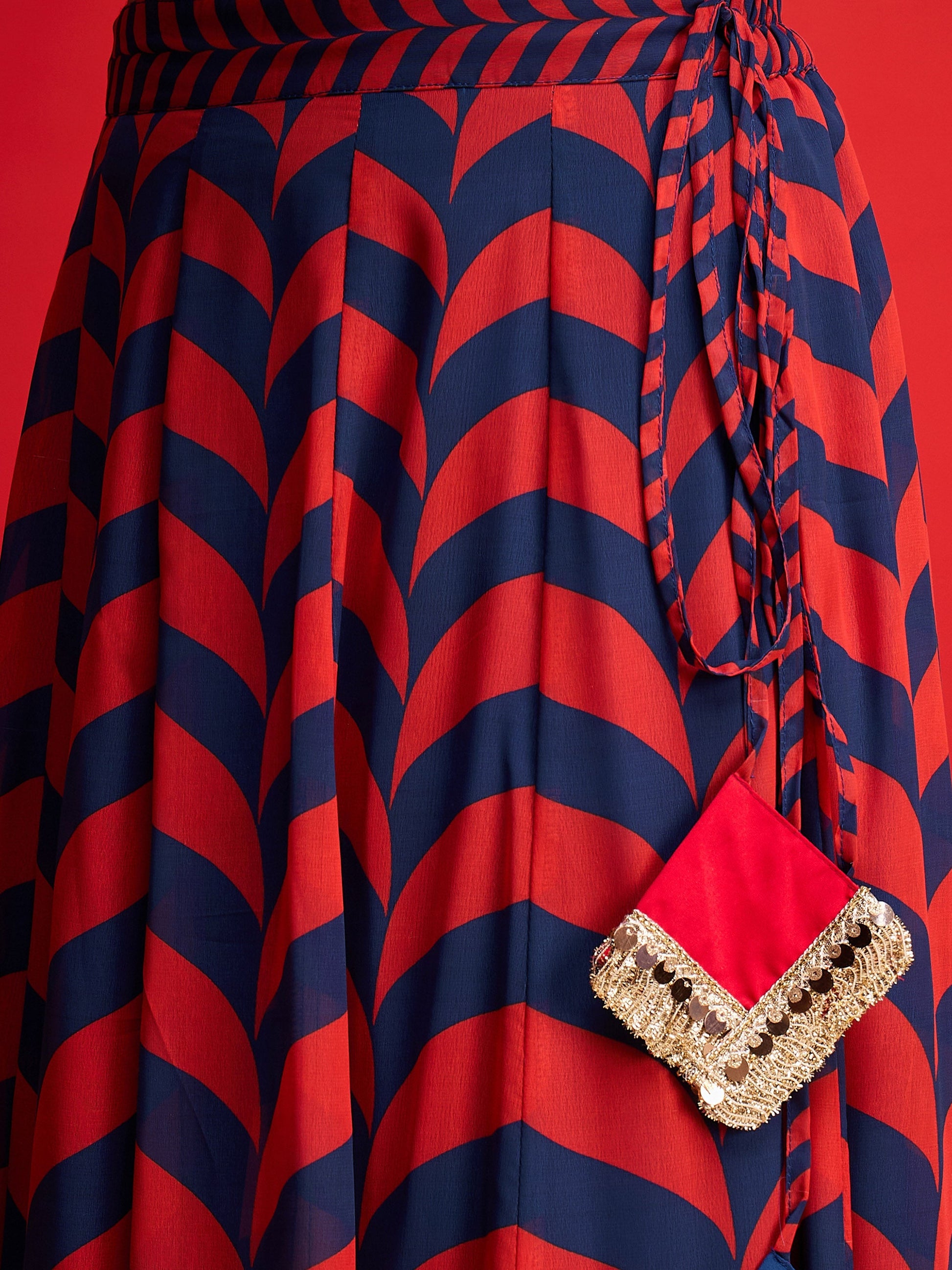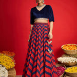 Navy Velvet Short Sleeves Crop Top With Anarkali Skirt, in Velvet fabric, Butter Crepe Lining, Crop Length, Fit & Flare / Comfort Fit, Hook & Eye, Straight Hemline and features Lace Detail At Waist