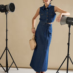 Women Navy Washed Denim Button Down Vest Top With Wrap Skirt