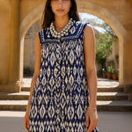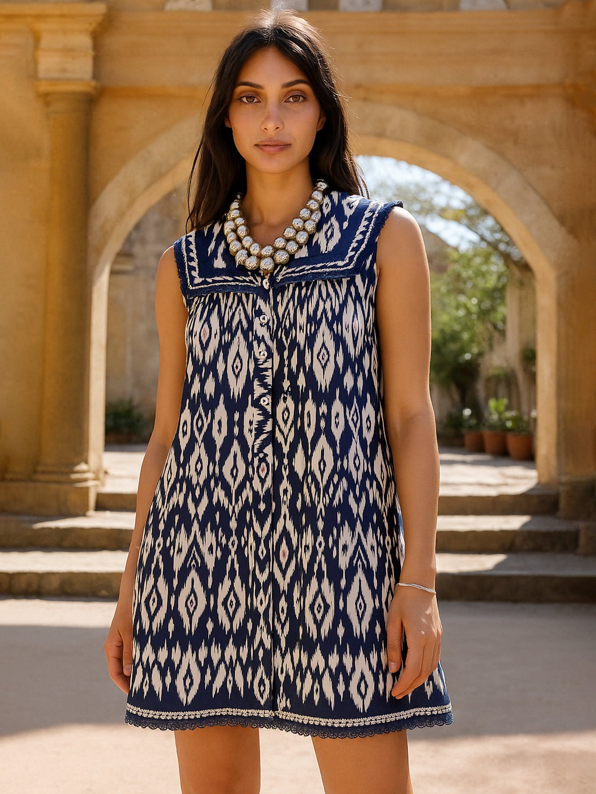 Navy & White Ikat Print Button Down Short Dress, in Cotton Poplin fabric, NA, Above Knee, Comfort Fit , Button Closure , Flared Hemline and features Lace Detail At Collar & Hem