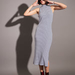 Navy & White Striped Rib Turtle Neck Sleeveless Dress, in Rib fabric, Unlined, Below Knee, Slim Fit, No Closure, Straight Hemline and features Slit At Side