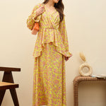 Neon Green Paisley Peplum Maxi Dress, in Summer Cool fabric, Poly Knit Lining, Below Knee, Fit & Flare, Button Closure, Flared Hemline and features Wrap Detail At Neck