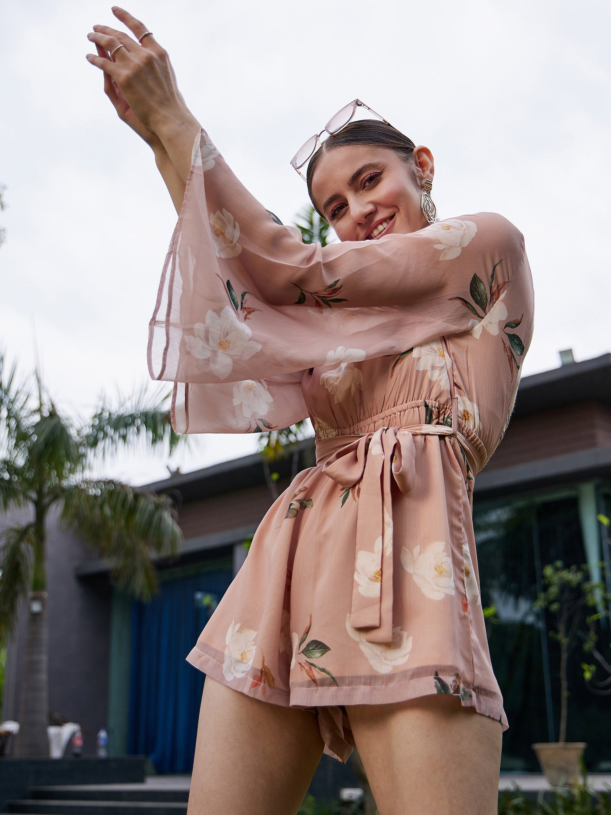Nude Floral Back Cut Out Playsuit, in Chiffon fabric, Polycrepe, Above Knee, Regular Fit, Button Closure, Straight Hemline and features Belt At Waist