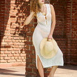 Off-White Crochet Sleeveless Beach Midi, in Crochet fabric, Unlined, Midi Length, Comfort Fit, Button Closure, Straight Hemline and features Hole Crochet Design and Golden Buttons