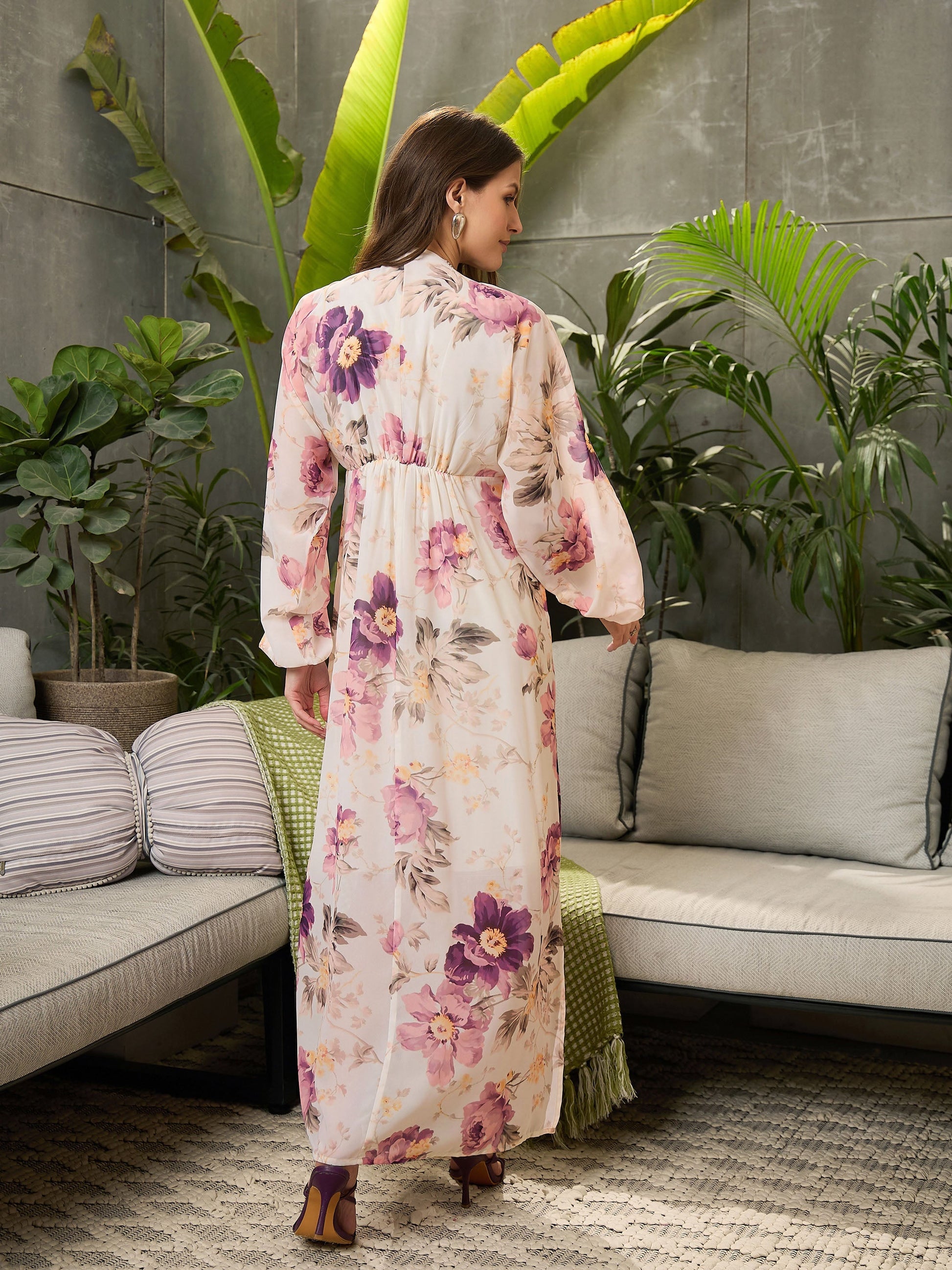 Off-White Floral Elasticated V-Neck Maxi Dress, in Georgette fabric, Poly Knit Lining, Full Length, Fit & Flare, NA, Straight Hemline and features Slit Detal At Both Side