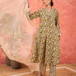 Women Off White & Green Floral Kurta With Pencil Pants & Dupatta