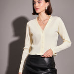 Off-White Rib Front Open Cardigan Top, in Rib fabric, Unlined, Regular Length, Regular Fit, Button Closure, Straight Hemline and features Plastic Button Detail At Front