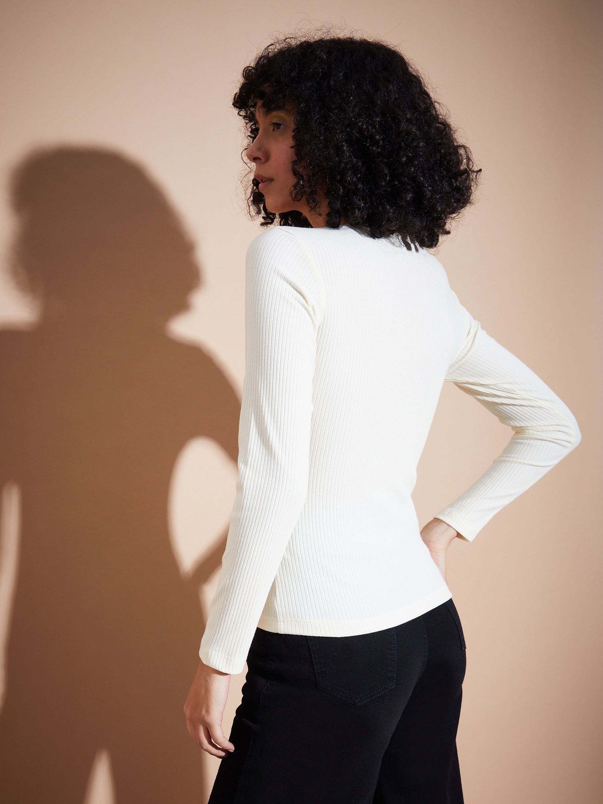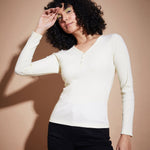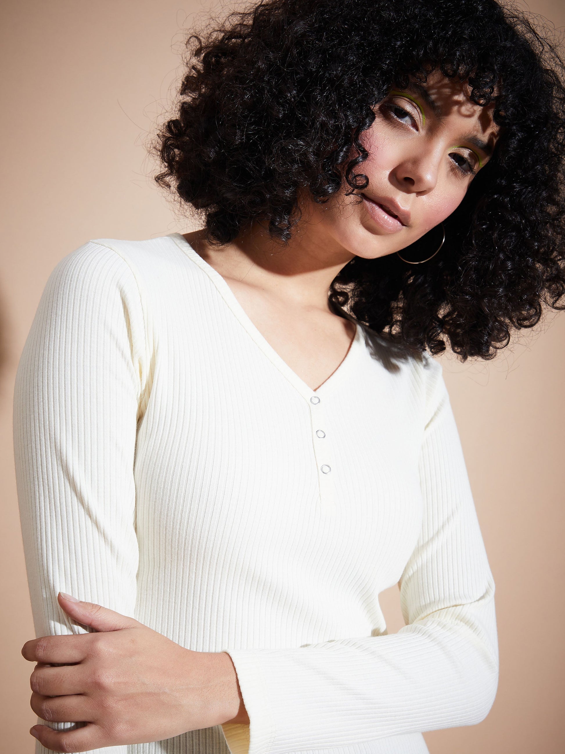 Off White Rib V-Neck Regular Top, in Rib fabric, Unlined, Regular Length, Slim Fit, Button Closure, Straight Hemline and features Snap Button Closure Detail At Neck