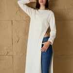 Off-White Round-Neck High Slit Sweater, in Flat Back Winter Rib fabric, Unlined, Below Knee, Comfort Fit, No Closure, Straight Hemline and features High Slit At Both Side