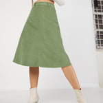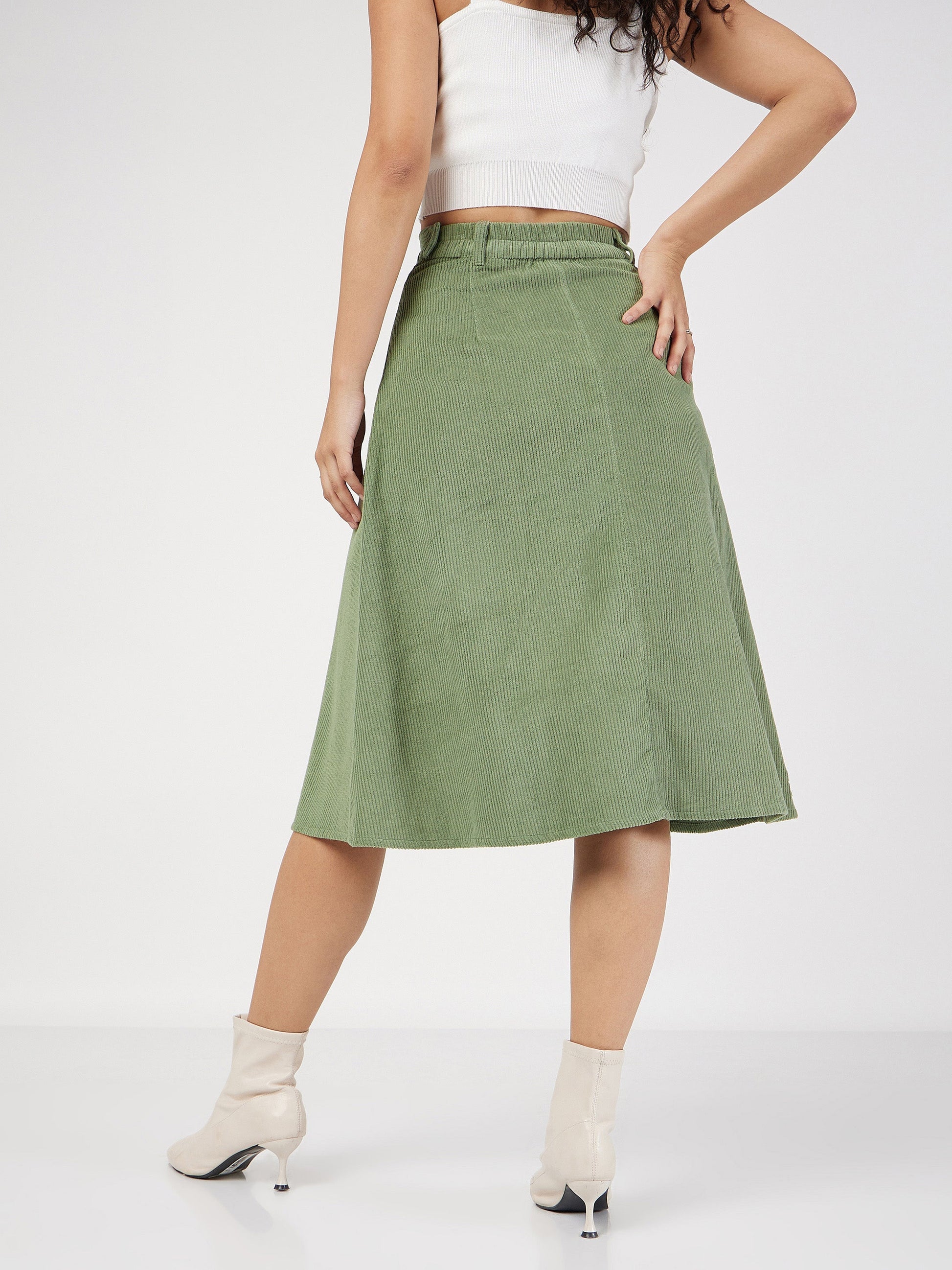 Olive Corduroy A-Line Midi Skirt, in Corduroy fabric, Unlined, Below Knee, A-Line, Button Closure, Flared Hemline and features PU Belt