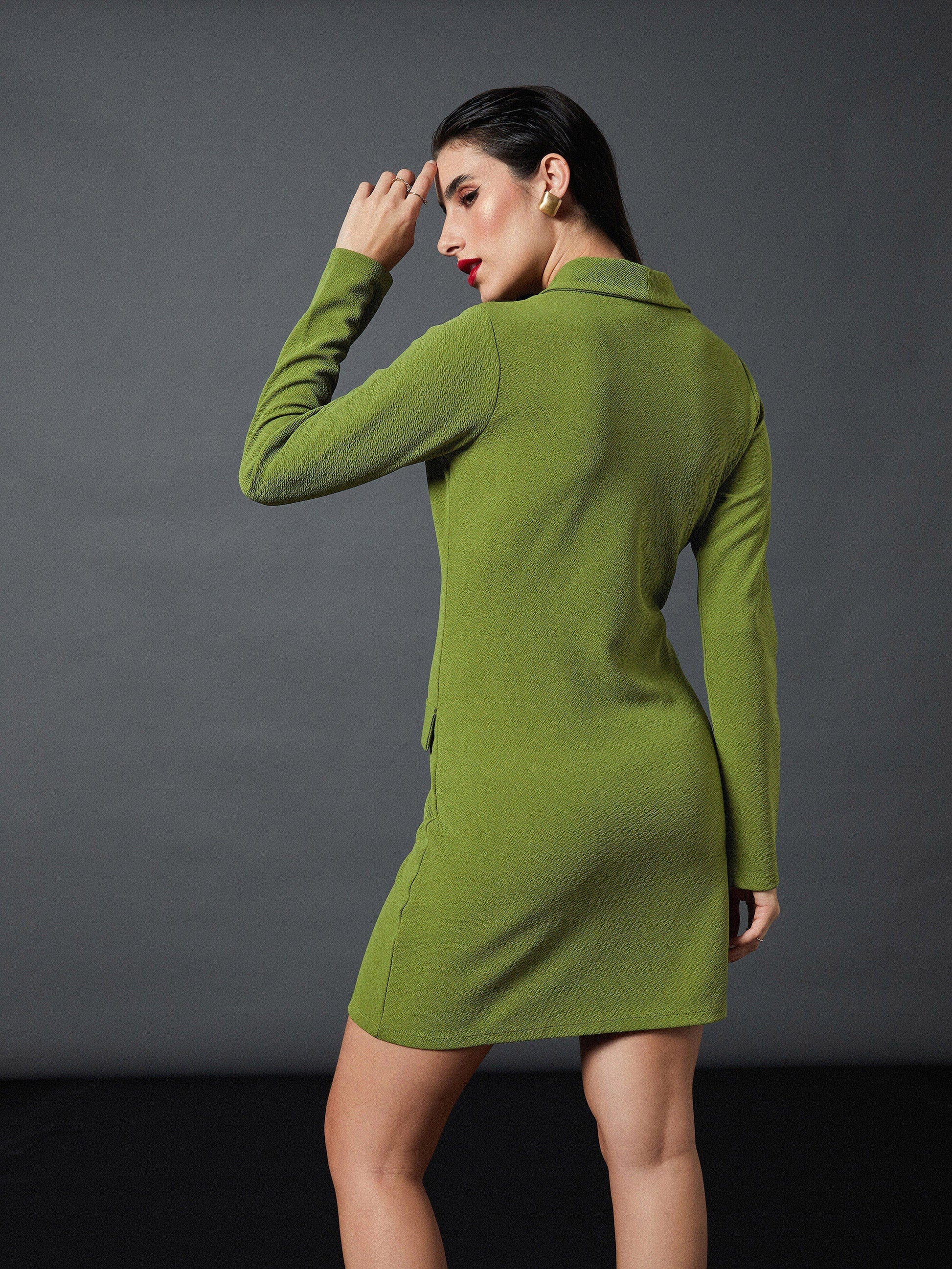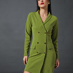 Olive Double Breasted Blazer Dress, in Karera Knit fabric, Unlined, Above Knee, Slim Fit, Button Closure, Straight Hemline and features Mock Pocket Detail