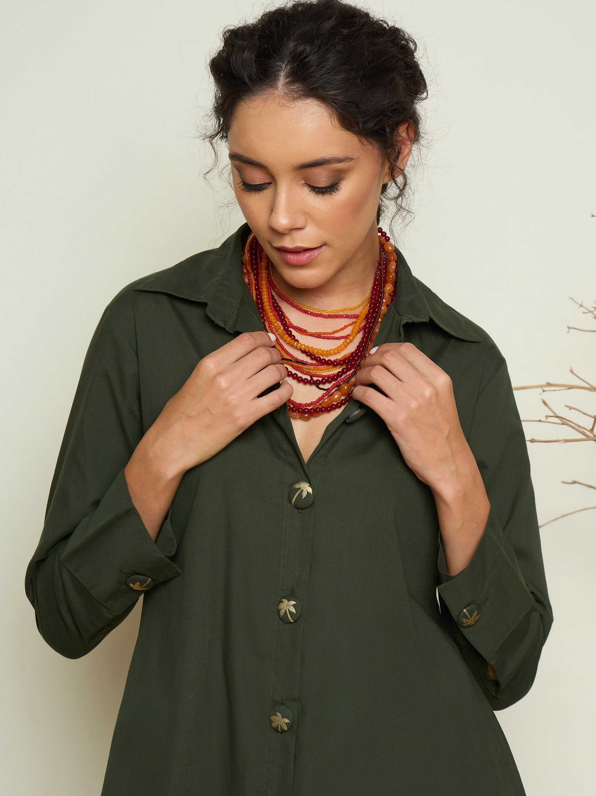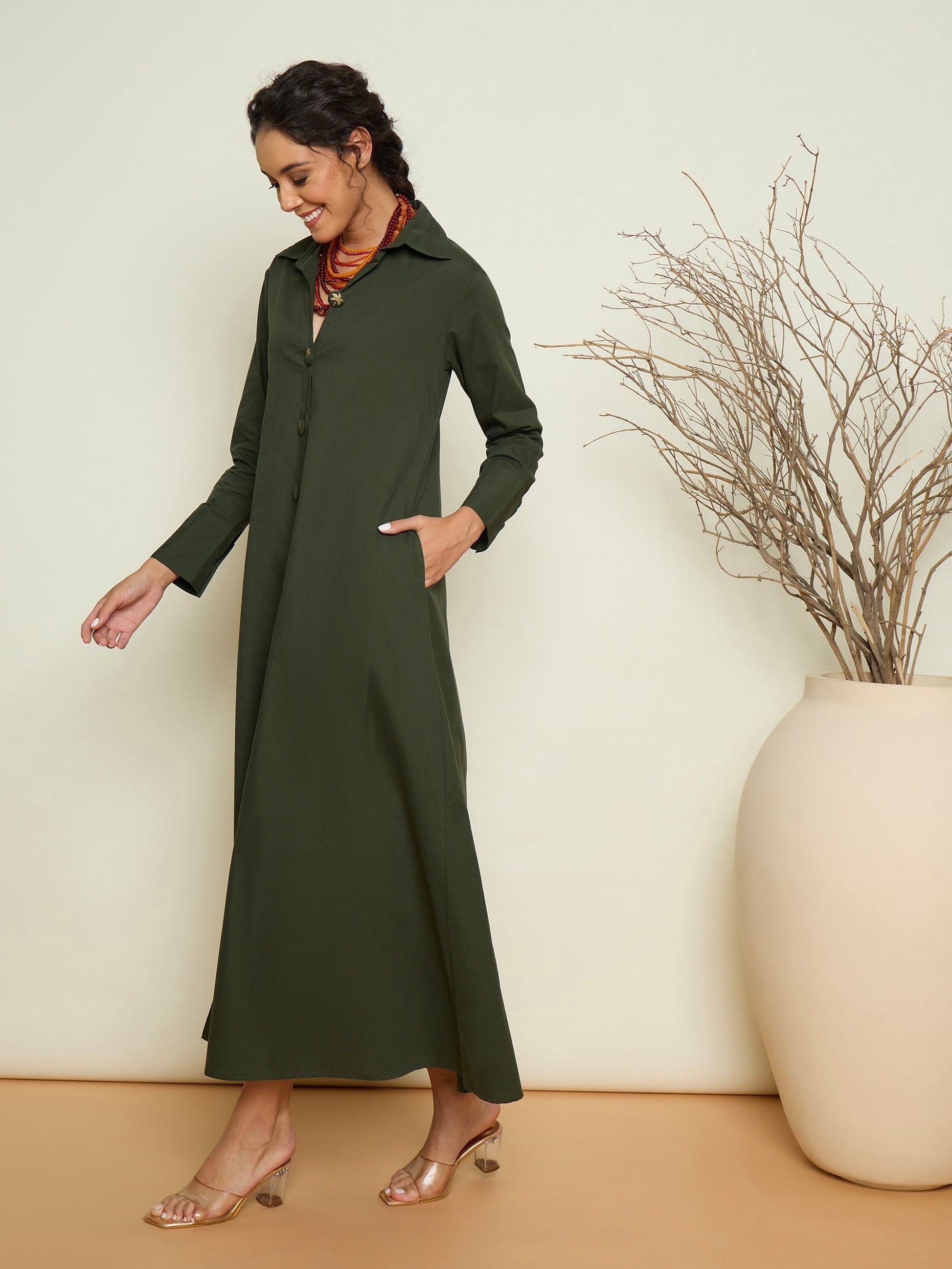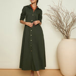 Olive Foil Print Longline Shirt Dress, in Cotton Poplin fabric, Unlined, Maxi Length, Comfort Fit, Button Closure, Straight Hemline and features Printed Button Detail At Front