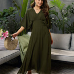 Olive Kimono Sleeve Maxi Dress, in Georgette fabric, Poly Knit Lining, Full Length, Fit & Flare, NA, Flared Hemline and features Smocking At Back