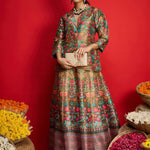 Women Olive Multi Floral Blazer Top With Anarkali Skirt