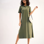 Olive Oversized Collar T-Shirt Dress, in Cotton Jersey fabric, Unlined , Midi Length, Oversized Fit, Button Closure, Straight Hemline and features Polo collar Detail