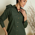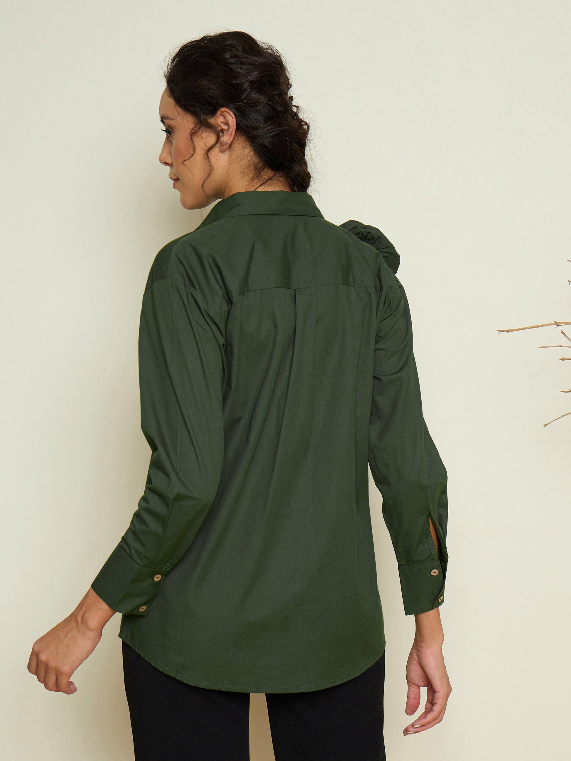 Olive Poplin Shoulder Corsage Regular Shirt, in Cotton Poplin fabric, Unlined, Regular Length , Comfort Fit, Button Closure, Straight Hemline and features Corsage Detail At Shoulder