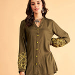 Women Olive Rayon Full Sleeves Embroidered Shirt