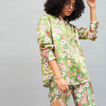 Olive Satin Floral Oversized Shirt, in Satin fabric, Unlined, Regular Length, Loose Fit, Button Closure, Curved Hemline and features Pig Nose Button Detail;