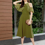 Olive Sleeve Frill Detail Midi Dress, in Karera fabric, Unlined, Below Knee, Fit & Flare, Zipper Closure, Flared Hemline and features Frill Detail At Neck & Sleeves