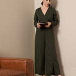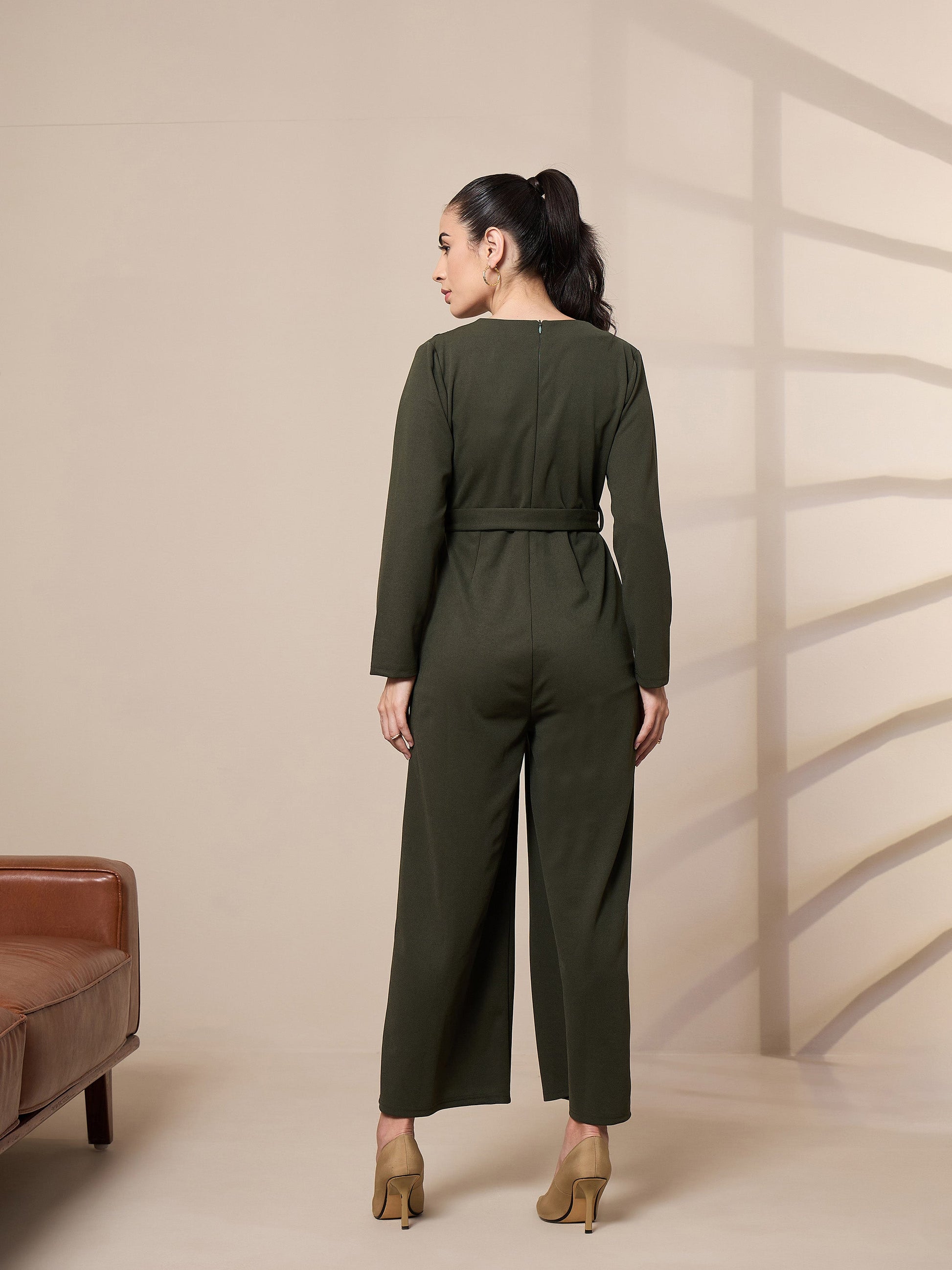 Olive V-Neck Belted Jumpsuit, in Canton Knit fabric, Unlined, Full Length, Comfort Fit, Zipper Closure, Straight Hemline and features Fabric Belt Detail