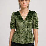 Olive Velvet Front Button Top, in Velvet fabric, Unlined, Regular Length, Regular Fit, Button Closure, Straight Hemline and features Fancy Button Detail At Front