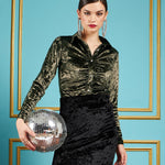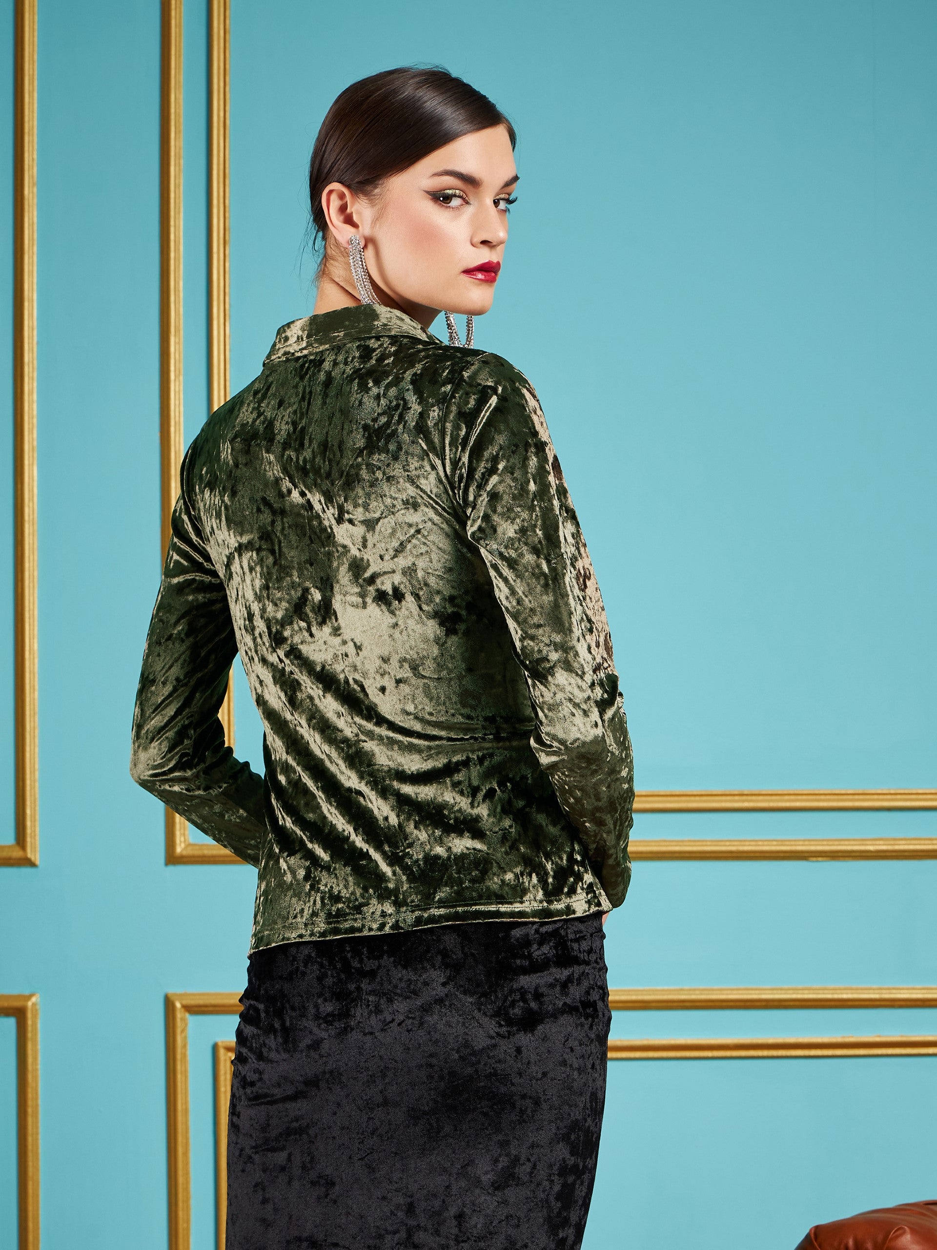 Olive Velvet Ruched Shirt, in Velvet fabric, Unlined, Regular Length, Slim Fit, Button Closure, Straight Hemline and features Self Fabric Button Detail