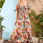 Women Orange Floral Puff Sleeves A-Line Midi Dress