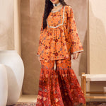 Orange Floral Short Kurta With Sharara Pants , in Georgette fabric, Butter Crepe Lining , Regular Length , Fit & Flare , No Closure, Flared Hemline and features Lace Detail At Front