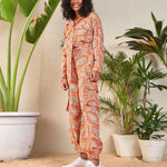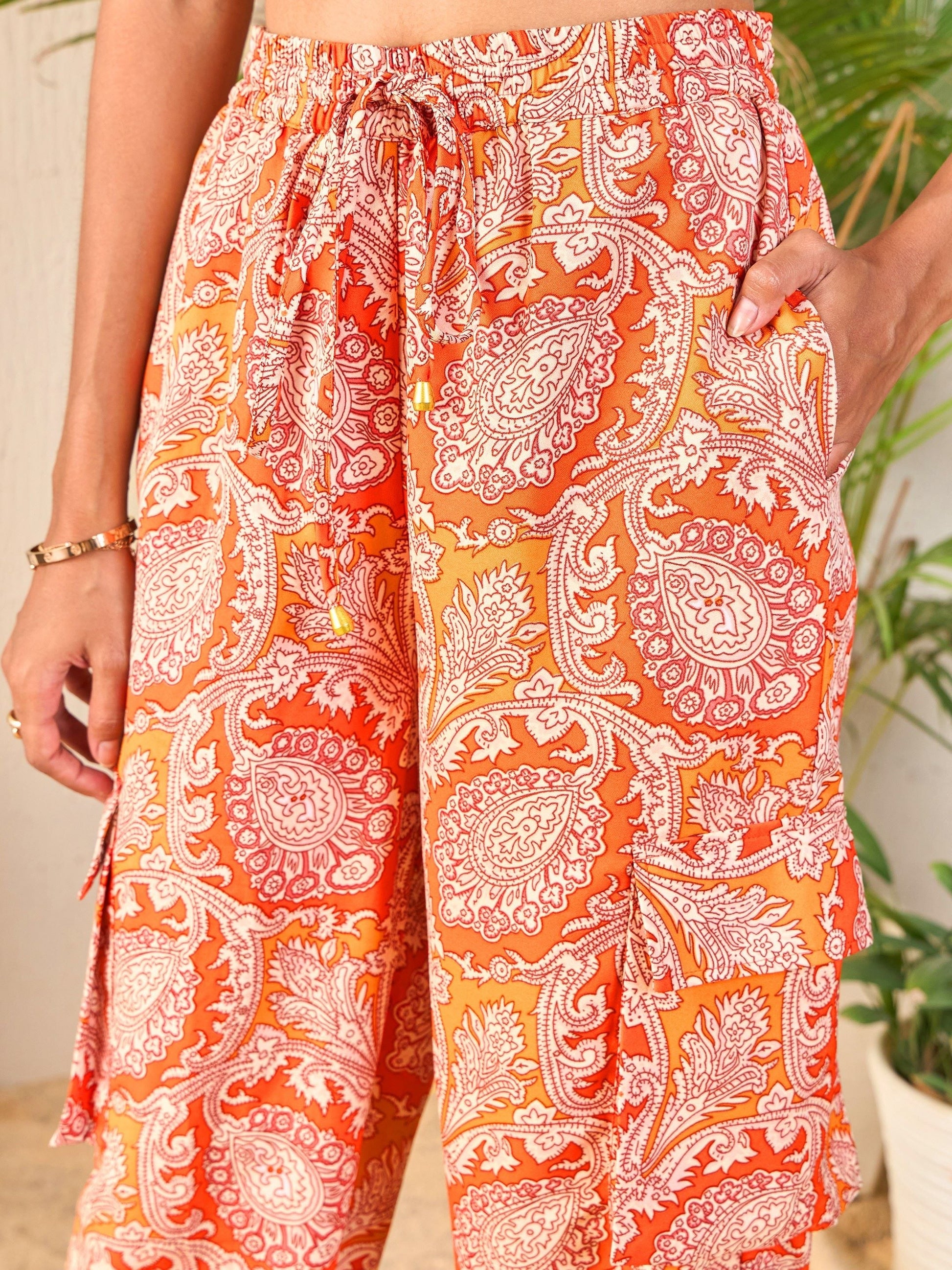 Orange Paisley Shirt With Jogger Pants, in Heavy Georgette fabric, Flap Pockets At Chest / Drawstring Detail, Ankle Length, Woven, High Low, Fabric: Heavy Georgette Hemline and features Flap Pockets At Chest / Drawstring Detail