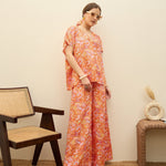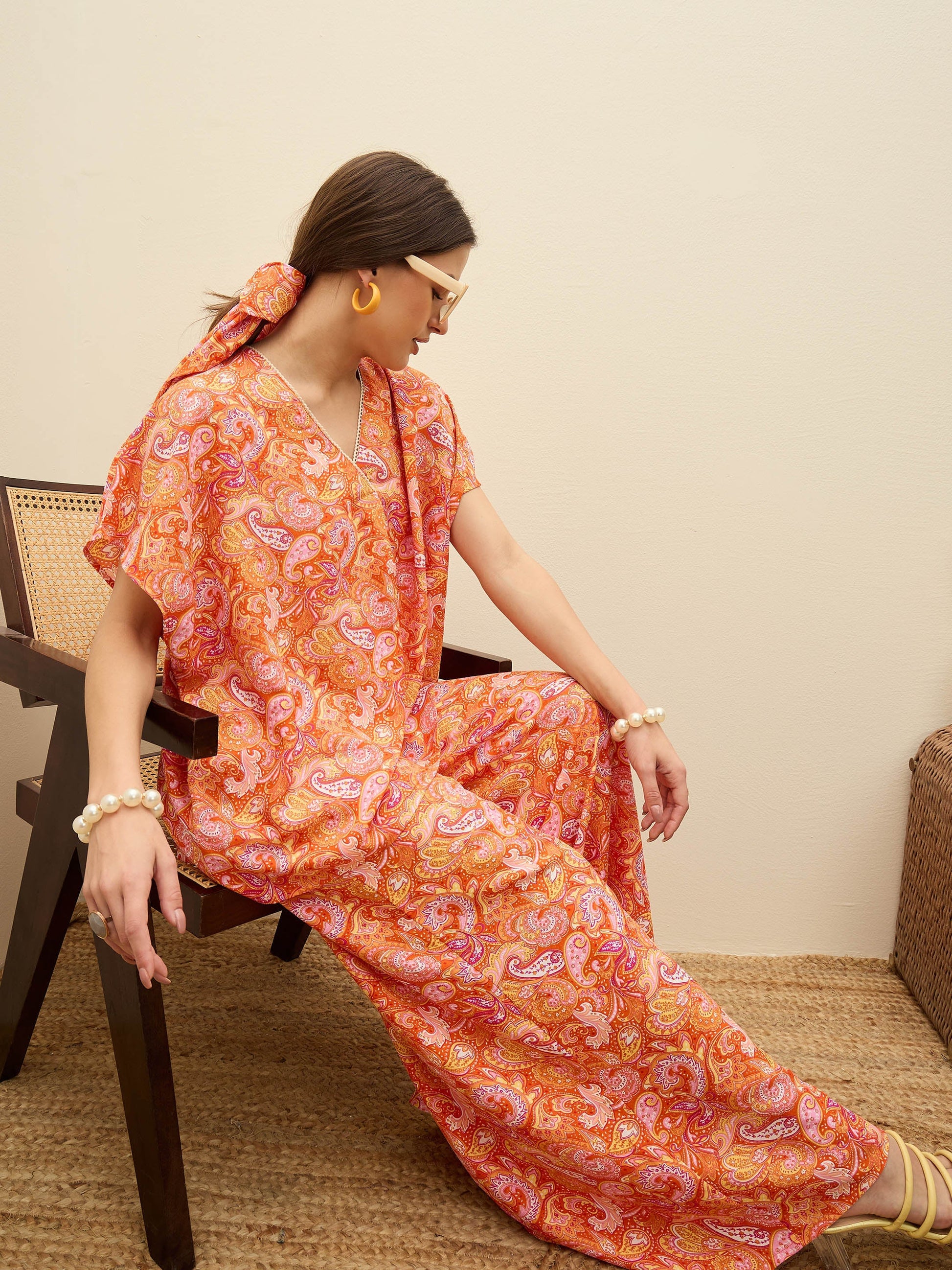 Orange Paisley V-Neck Top With Flared Pants, in Summercool fabric, Polyknit Lining, Regular Length, Comfort Fit, Slip On , Straight Hemline and features Lace Detail At Neck /Drawstring At Waist