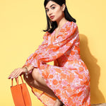Orange & Pink Floral Front Button Dress, in Georgette fabric, Poly Knit, Above Knee, A line, Button Closure, Straight Hemline and features Yoke Detail At Waist
