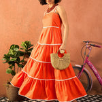 Orange Ric Rac Lace Strappy Tiered Maxi Dress, in Cotton Poplin fabric, Unlined, Maxi Length , Fit & Flare , No Closure , Flared Hemline and features Ric Rac Lace Detail