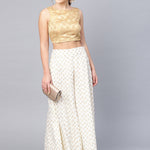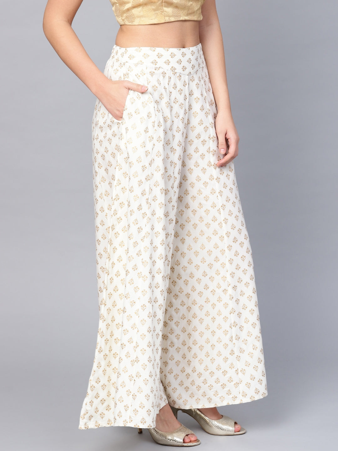 White Ethnic Motif Printed Rayon Flared Women Palazzo With One Pocket
