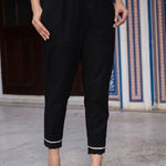 Black Solid Cotton Women Slim Fit Laced Pants With Single Side Pocket & Drawstring