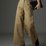 Pastel Olive Twill Flared Pants, in Cotton Twill fabric, Unlined, Full Length, Comfort Fit, Button Closure, Straight Hemline and features Elastic At Back Waist
