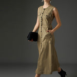 Pastel Olive Twill Waist Cut-Out Midi Dress, in Cotton Twill fabric, Unlined , Midi Length, A-Line , Button Closure , Flared Hemline and features Contrast Stitch Detail