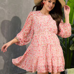 Peach Ditsy Floral Tiered Short Dress, in Georgette fabric, Poly Knit Lining, Above Knee, Fit & Flare, Button Closure, Flared Hemline and features Key-Hole Detail At Back