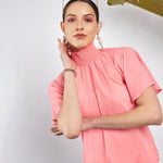 Peach Smocked High Neck Top, in Heavy Georgette fabric, Unlined, Regular Length, Comfort Fit, Button Closure, Straight Hemline and features Smocking Detail At Neck