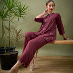 Pink All Over Embroidered Shirt With Palazzos, in Rayon fabric, Unlined, Regular Length, Comfort Fit, Button Closure, Straight Hemline and features All Over Embroidered Detail