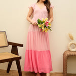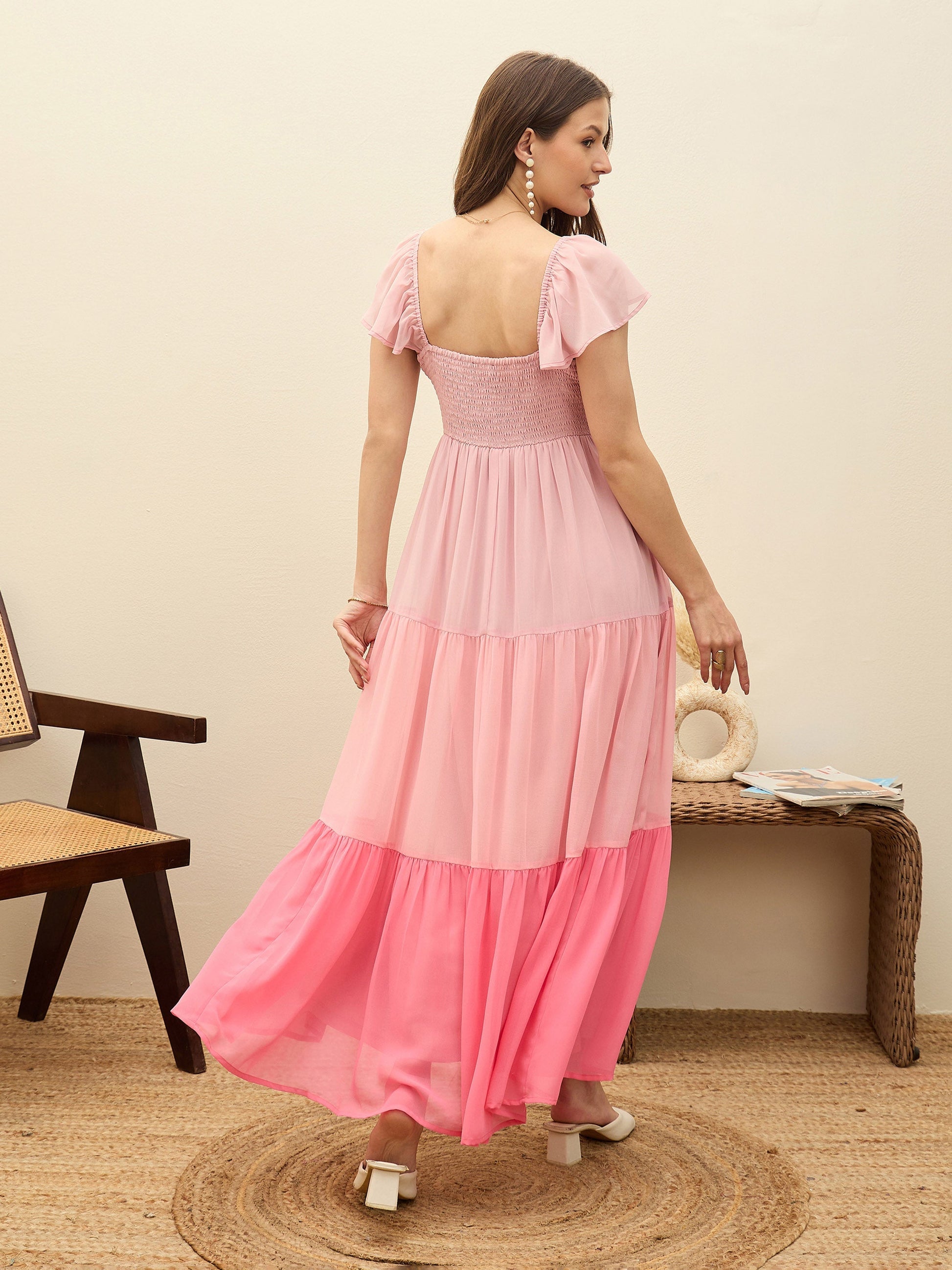 Pink Color Blocked Frill Sleeves Tiered Maxi Dress, in Georgette fabric, Poly Knit Lining, Below Knee, Fit & Flare, NA, Flared Hemline and features Smockig Detail At Back