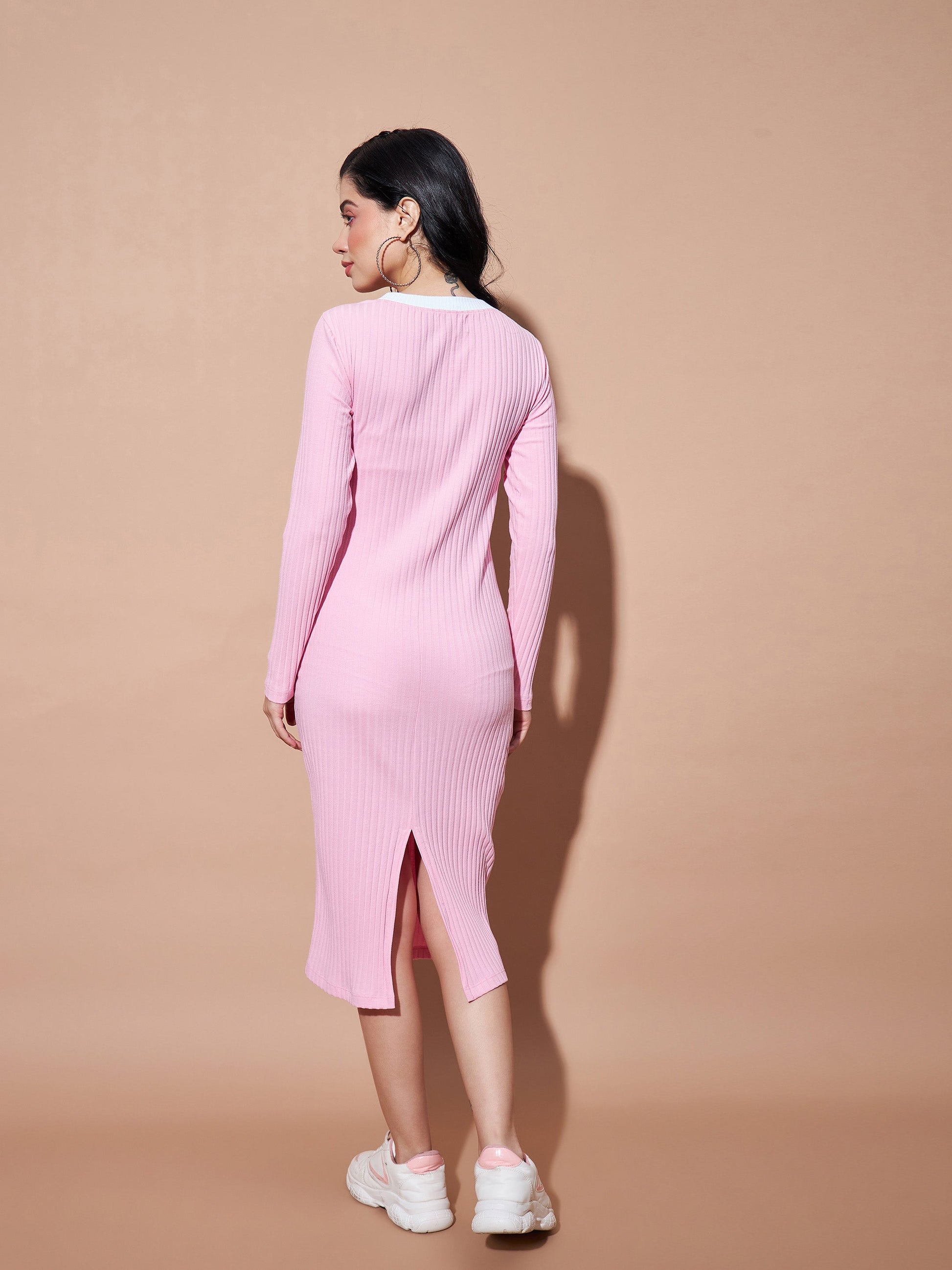 Pink Contrast Rib Bodycon Rib Dress, in Cotton Rib fabric, Unlined, , Slim Fit , No Closure, Straight Hemline and features Contrast Rib At Neck