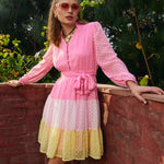 Pink Dobby Color Blocking Tiered Short Dress, in Swiss Dobby fabric, Polyknit Lining, Above knee, Fit & Flare, Button Closure, Flared Hemline and features Belt At Waist